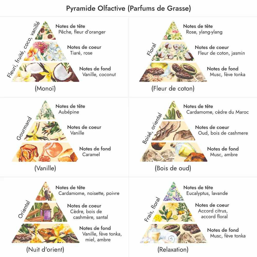 Offrez une expérience olfactive unique avec nos fragrances d’exception, élaborées à Grasse, capitale du parfum en France. Choisissez parmi 6 parfums raffinés, conçus spécialement pour nos bougies, diffusent des senteurs authentiques et envoûtantes, alliant qualité et intensité. Transformez chaque moment en un instant magique grâce à des compositions uniques et subtiles.