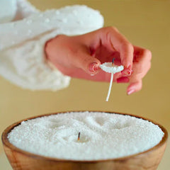Prenez une mèche (fournie avec votre bougie Perlée) et insérez-la au centre des perles. Assurez-vous qu’elle soit bien droite pour garantir une combustion uniforme. Laissez dépasser environ 1 cm de la mèche au-dessus des perles.